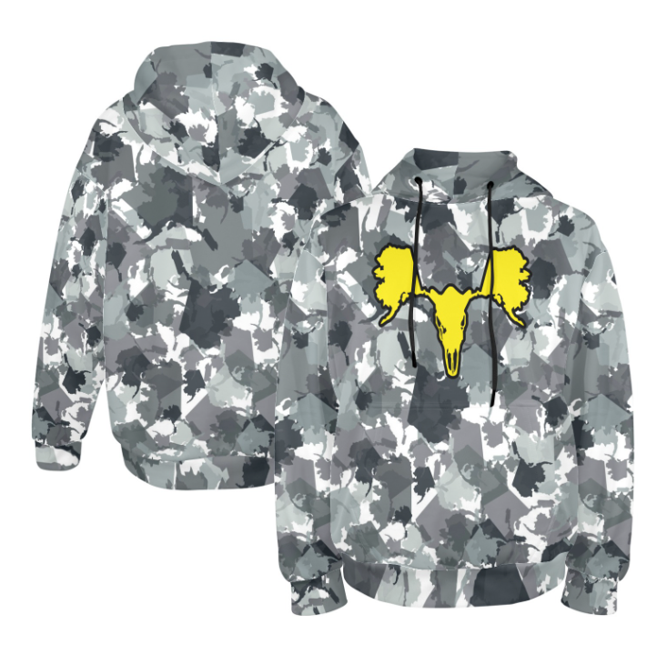 Our popular, proprietary Alaska shape "camo" pattern in one of the many colorway options with the addition of a moose skull that has the shape of AK for antlers!