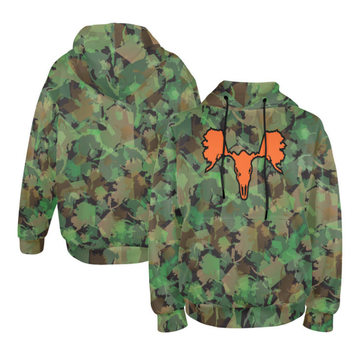 Our popular, proprietary Alaska shape "camo" pattern in one of the many colorway options with the addition of a moose skull that has the shape of AK for antlers!